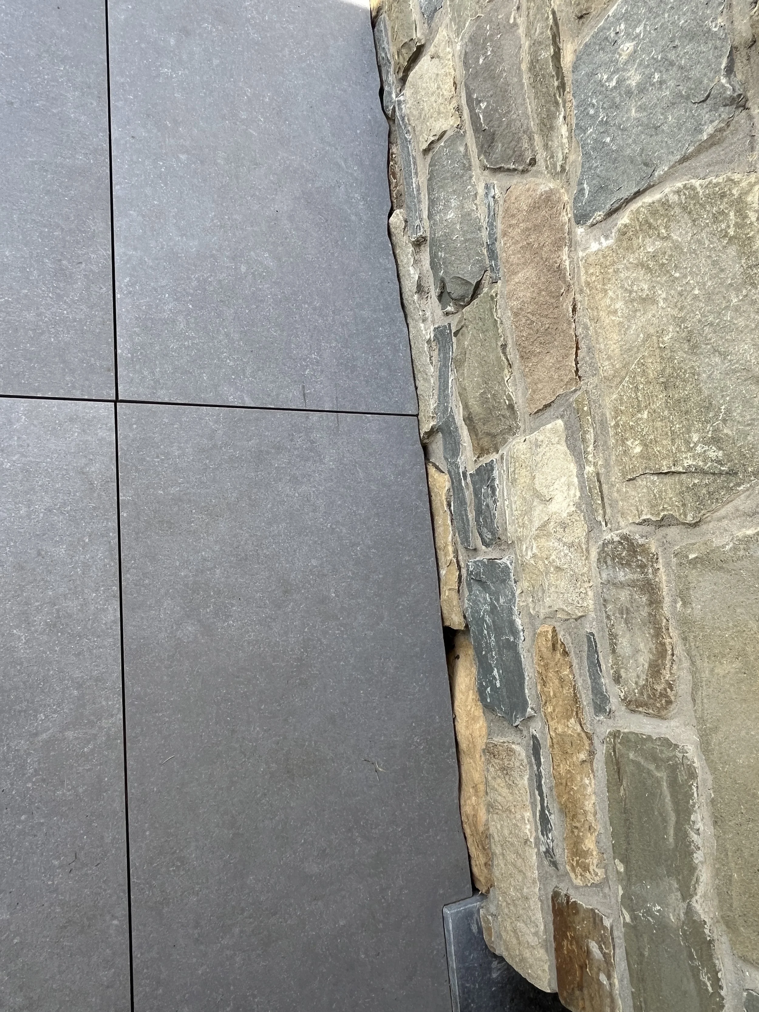 Sol en pierres de pavage en plusieurs nuances de gris, beige et marron