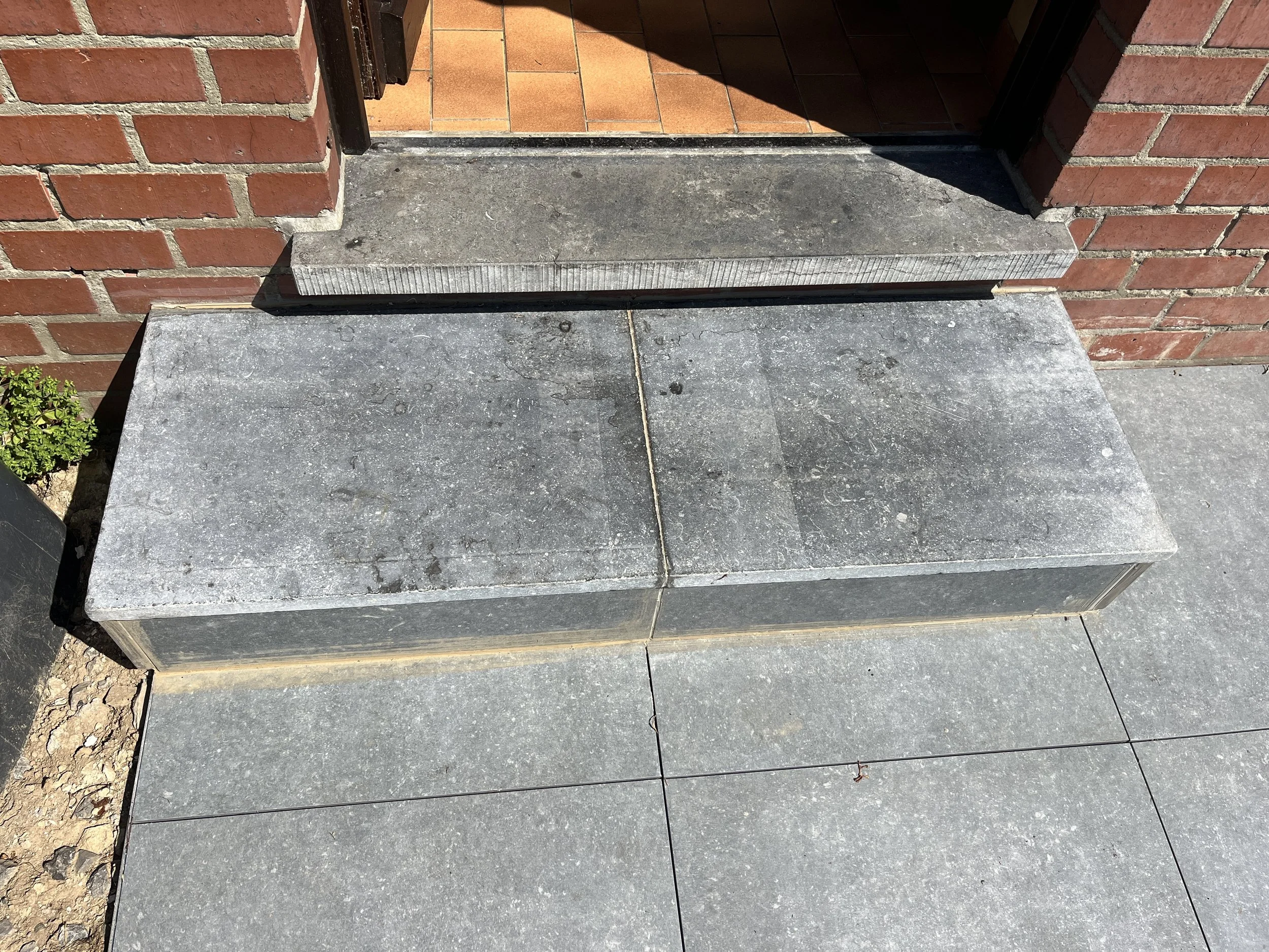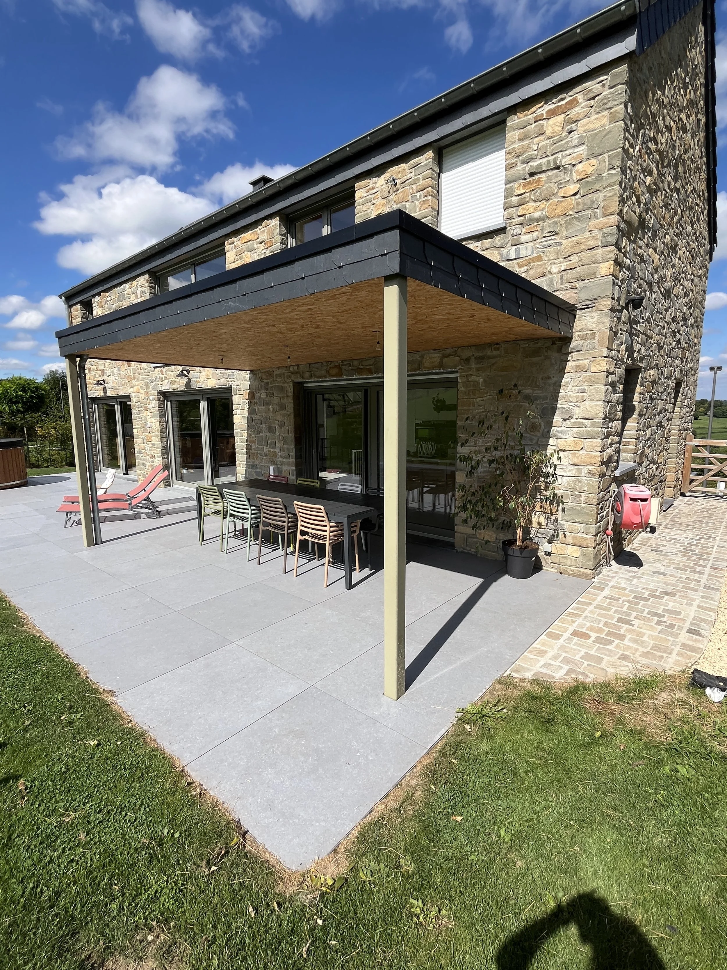 Allée pavée en pierre, parterre en gravier et jardinières en pierre - détails