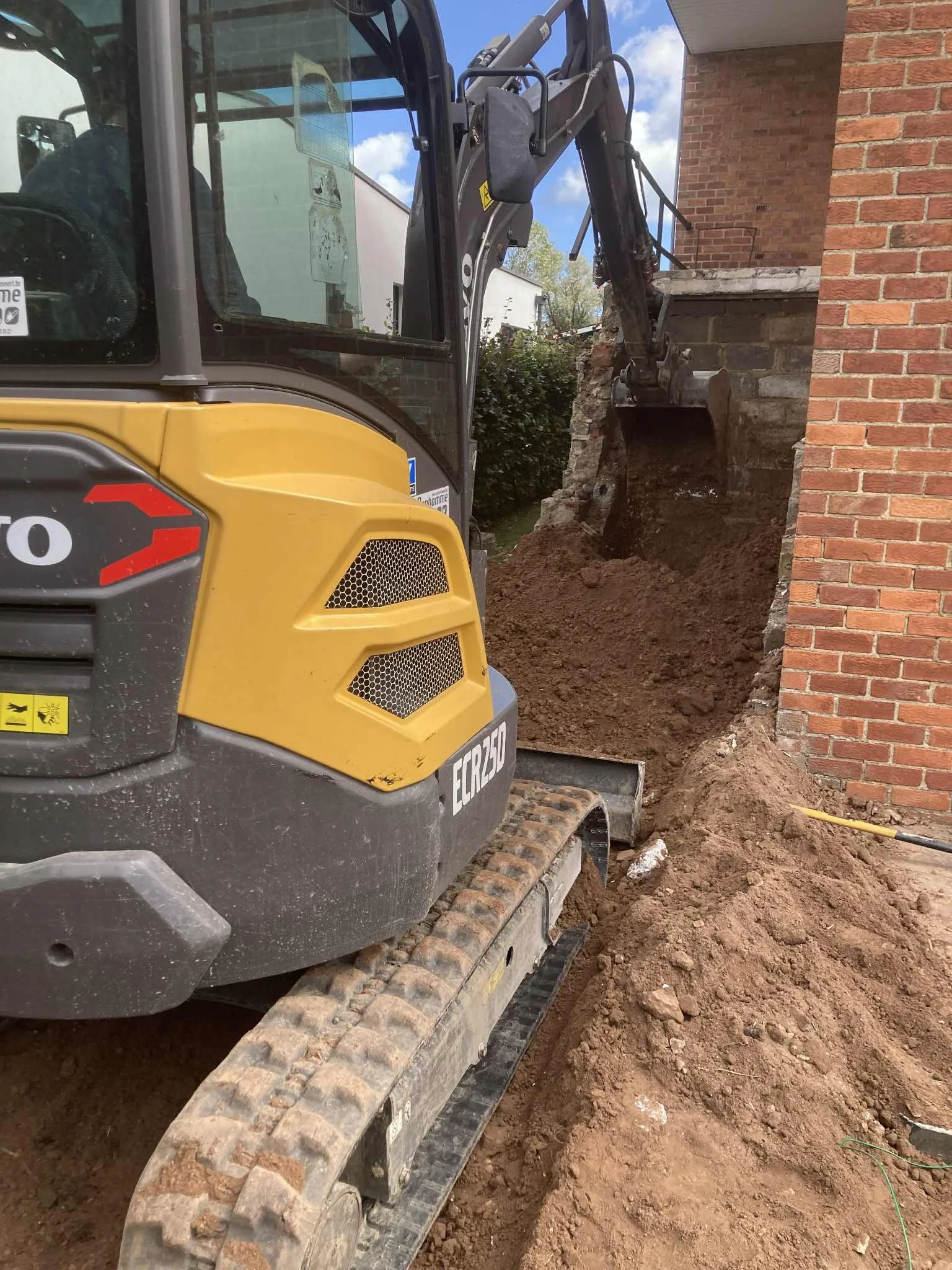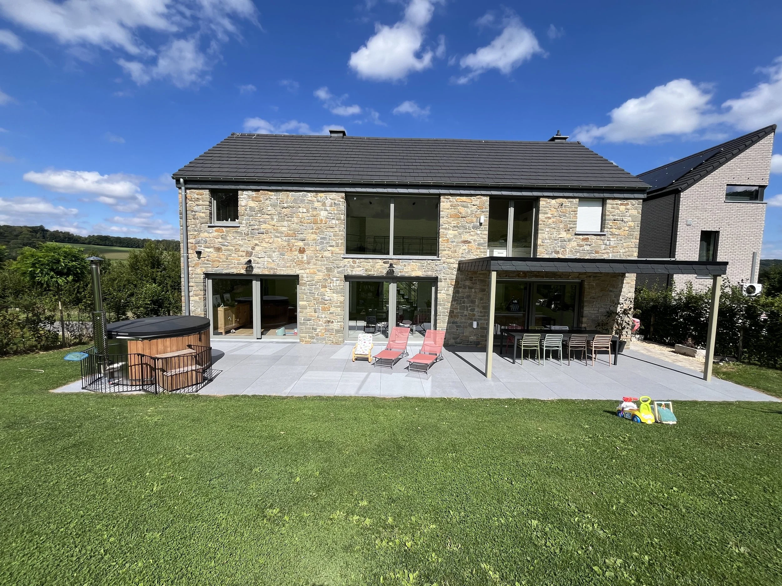 Allée pavée en pierre, parterre en gravier et jardinières en pierre